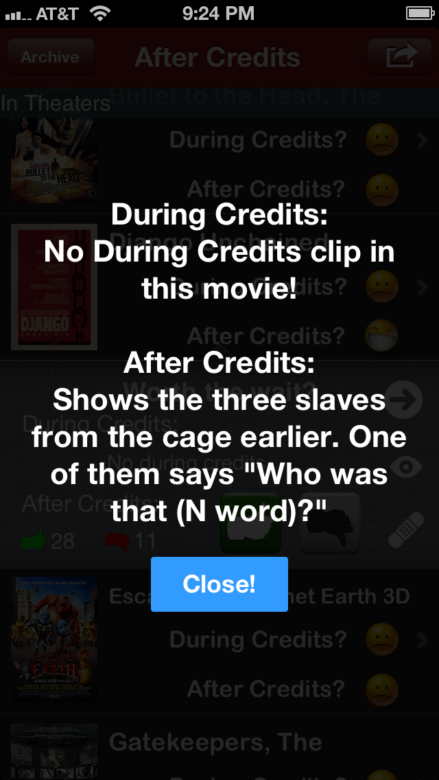 When you tap on the eyeball, spoilers for During and After credits appear. This could be a short sentence or a huge paragraph depending on what users submit. Most of the spoilers that I had to insert into old movies were taken from two sites: mediastinger.com and aftercredits.com. I appreciate these sites for having these and I give credits to these sites for every spoiler that I use from them. That view also is the new alert view design courtesy of MBAlertView. It is beautiful, simple, and elegant. I might use this on all my app as it looks 100x better than Apple’s alert view.