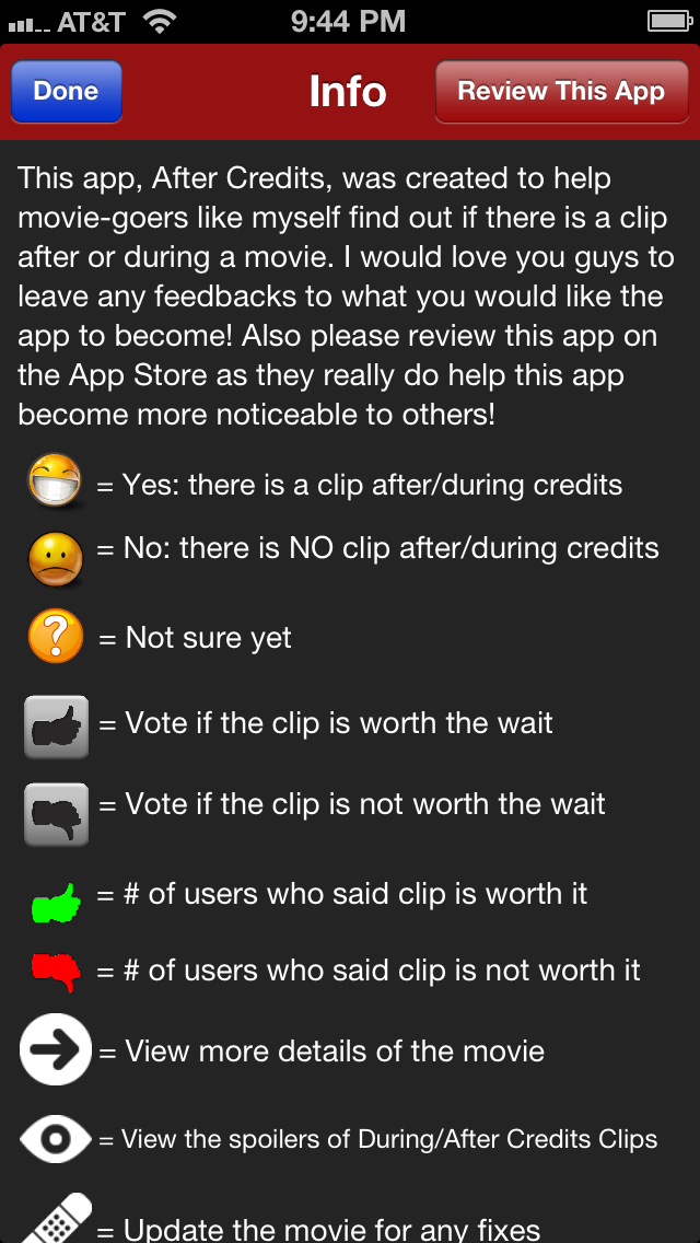I realize that I didn’t update this info page with the last update. Some people were confused at what the arrow/bandaid did. Now when you start the app, you’ll be greeted with this new info page. Even if you’ve seen it before, I feel that there’s been so much added that you would need to see it again. I mean who would know an eyeball stands for spoilers right?