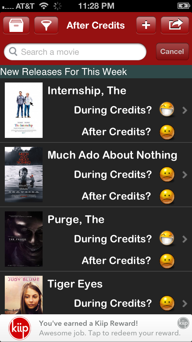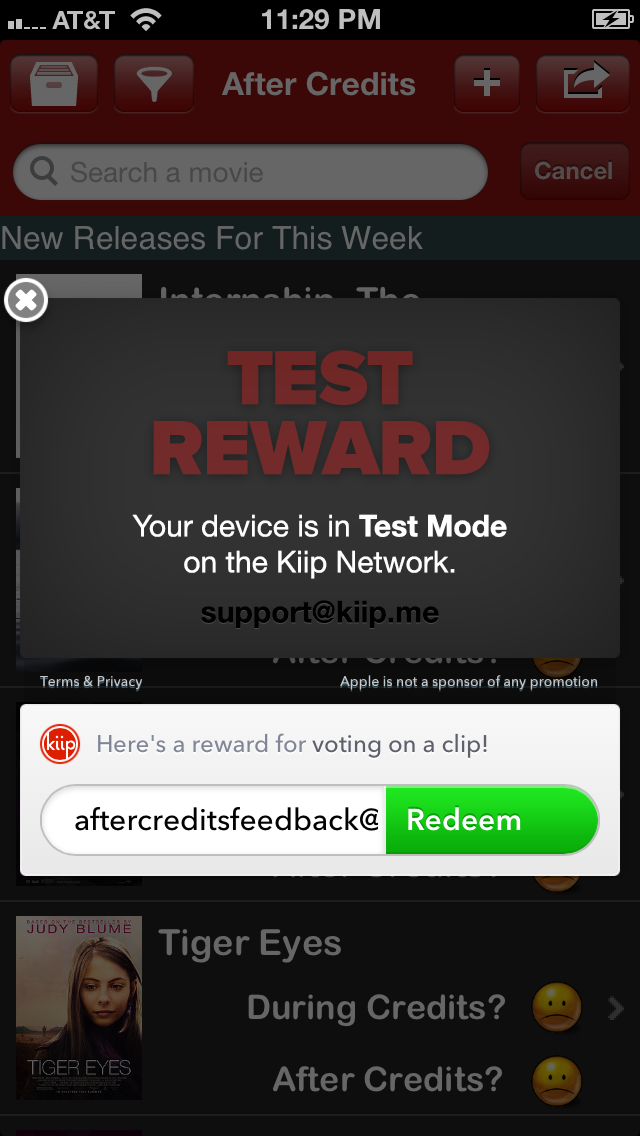 Introducing Kiip Reward! I’ve partnered up with Kiip to reward users that contribute. An reward banner will pop up after a certain amount of time that the user votes, submit, or update. This amount of time of contribution is random so that users could not just keep voting for every movie. The rewards will be tied to entertainment area so you’ll see rewards like gift certificates for theaters or free movie rentals at RedBox.